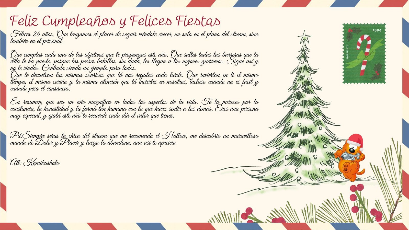 Muchas felicidades a nuestra pequeña Bubu. Qué decirte… La verdad es que no es fácil poner en palabras todo lo que transmites. Para empezar, eres un ejemplo de lucha enorme para todos los que estamos en tu comunidad. No solo por lo que te toca vivir, sino por cómo lo afrontas, por cómo sigues adelante y por cómo, incluso en los días difíciles, consigues sacarnos una sonrisa. Ojalá puedas celebrar tu cumpleaños como te mereces, pese a todos los problemas, y que mañana también puedas disfrutar de la Navidad. Aunque bueno… seamos claros, ¿a quién se le ocurre nacer en estas fechas? Espero de corazón que te haya gustado este pequeño regalo de cumpleaños. No es la cura para tu enfermedad (no soy Dalas y no tengo un laboratorio), pero sí es una prueba muy clara de algo importante: no estás sola, y no vas a volver a estarlo. Tienes detrás a una comunidad enorme que te quiere, que te valora y que está contigo. Gente que disfruta de tu contenido, de los momentos Bubu, de tu forma de ser tan tuya, como hemos visto a lo largo de estos 23 días. Momentos que se quedan, que importan y que hacen que cada directo sea algo más que un simple stream. Y por supuesto, el mejor cine del mundo. Ejm… no nos demandes, Nintendo, Sony, Microsoft… Por mi parte, solo queda desearte lo mejor, pero de verdad, de corazón. Y empezar a pensar qué regalarte el año que viene, que sea más original que esto. Sigue haciendo lo que te gusta, sigue siendo tú y sigue sonriendo, porque tu comunidad sonríe contigo en cada directo, y camina contigo en todo lo demás.